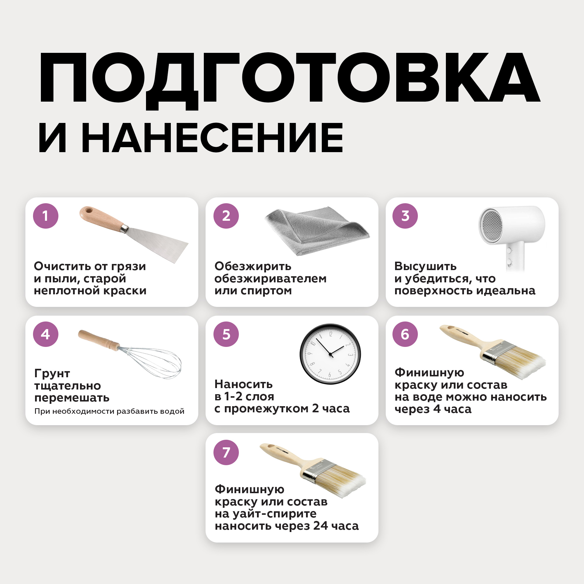 Перед нанесением грунт-краски необходимо убедиться, что рабочая поверхность сухая и чистая: очистить от грязи и пыли, посторонних включений. Участки, пораженные плесенью, предварительно обработать до полного устранения биопоражения.