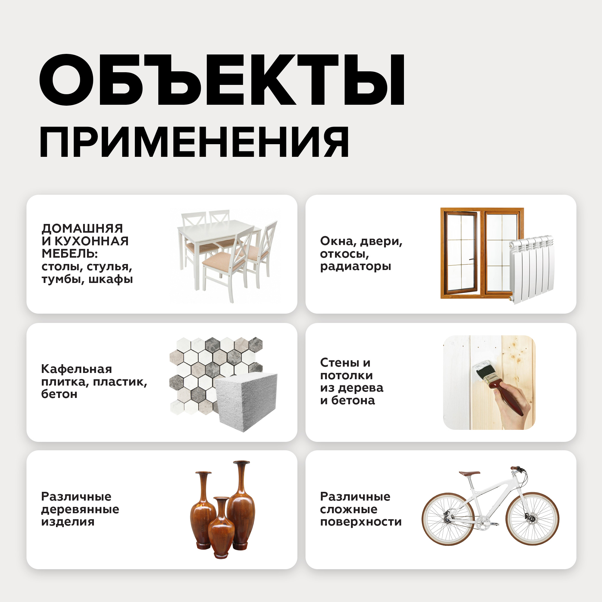 Подходит для окраски различных по впитывающей способности, в том числе сложных и ранее окрашенных, поверхностей из различных материалов: дерево, фанера, МДФ, бетон, кирпич, камень, штукатурка, лепнина, окрашенный или оцинкованный металл, некоторые виды кафеля и керамо/гранита, матовый пластик и вспененный полиуретан, матовое стекло, лакированные поверхности и др..