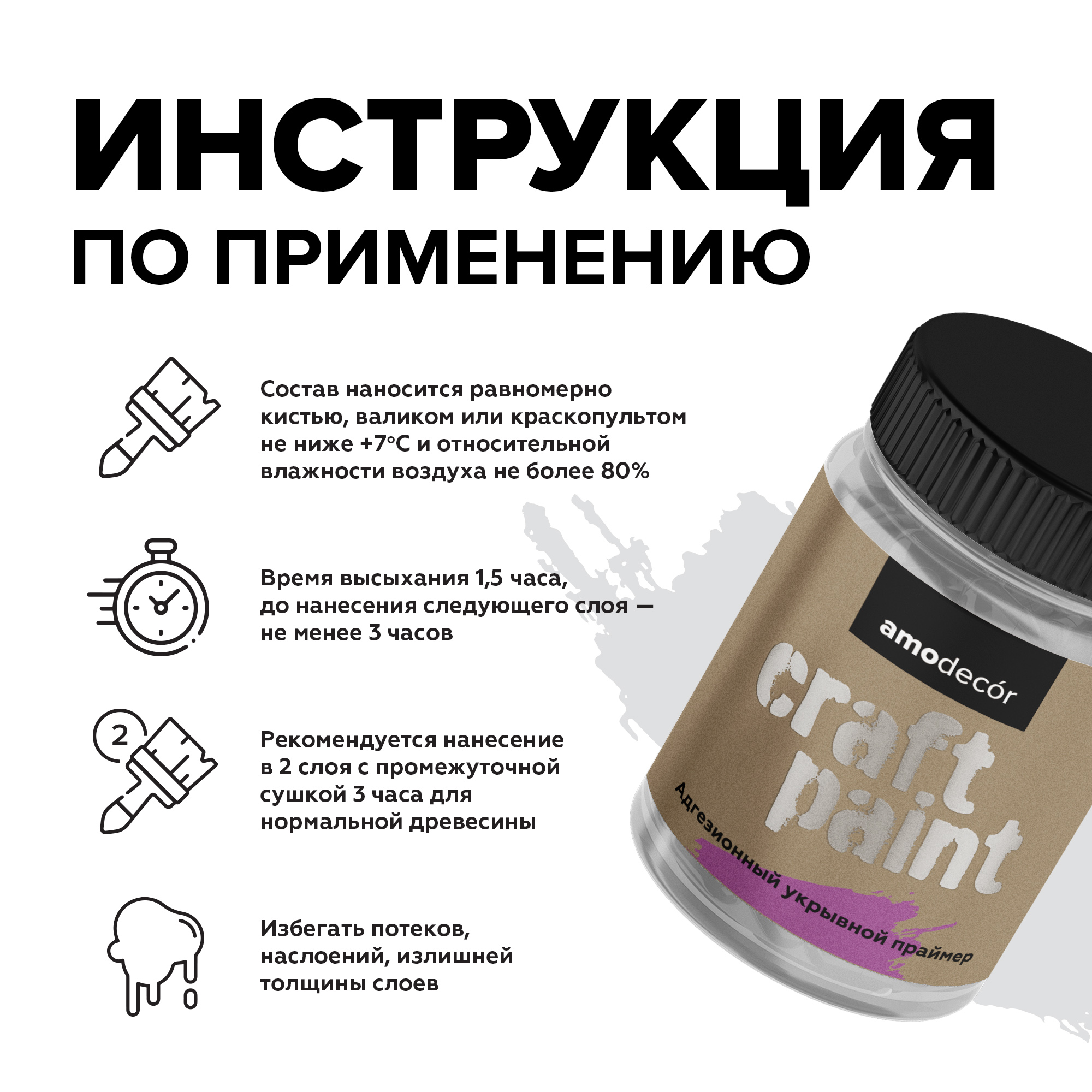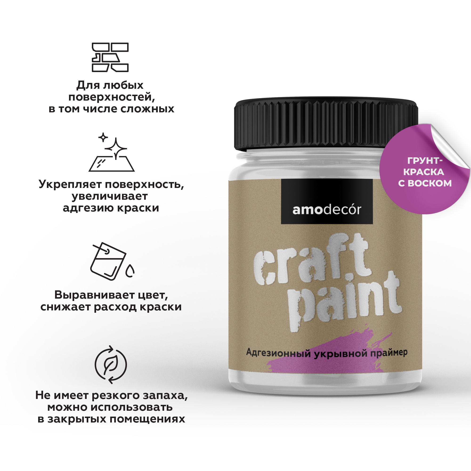 Адгезионный укрывной грунт AMO craft AMO craft — это универсальный праймер- грунтовка на водной основе, специально разработанный для обеспечения отличной адгезии на самых разнообразных поверхностях. Благодаря своей кроющей способности, этот грунт идеально подходит как для мебели, так и для ранее окрашенных поверхностей, включая кафельную плитку. Уникальное свойство AMO craft заключается в его способности надежно склеивать материалы, обеспечивая прочное основание под последующую окраску. Отличительная особенность продукта — отсутствие запаха, что делает его безопасным для использования в жилых помещениях. Кроме того, AMO craft легко колеруется, позволяя подобрать цвет под любые дизайнерские решения. Используйте AMO craft для качественного покрытия сложных поверхностей, обеспечивая долговечность и красоту вашего интерьера! со склада в наличии и под заказ в любых объемах.