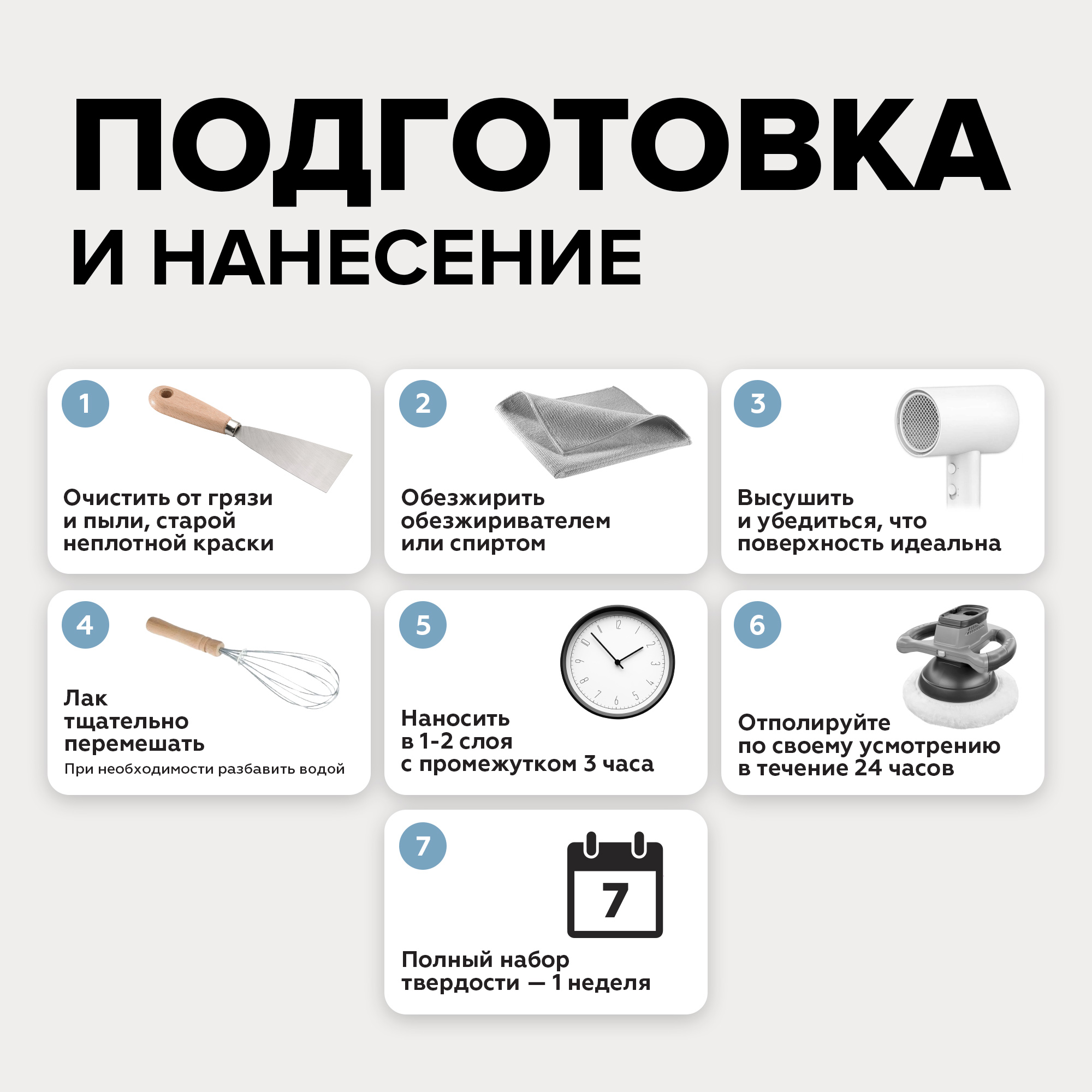 Перед нанесением лака необходимо убедиться, что рабочая поверхность сухая и чистая: очистить от грязи и пыли, посторонних включений. Участки, пораженные плесенью, предварительно обработать до полного устранения биопоражения.