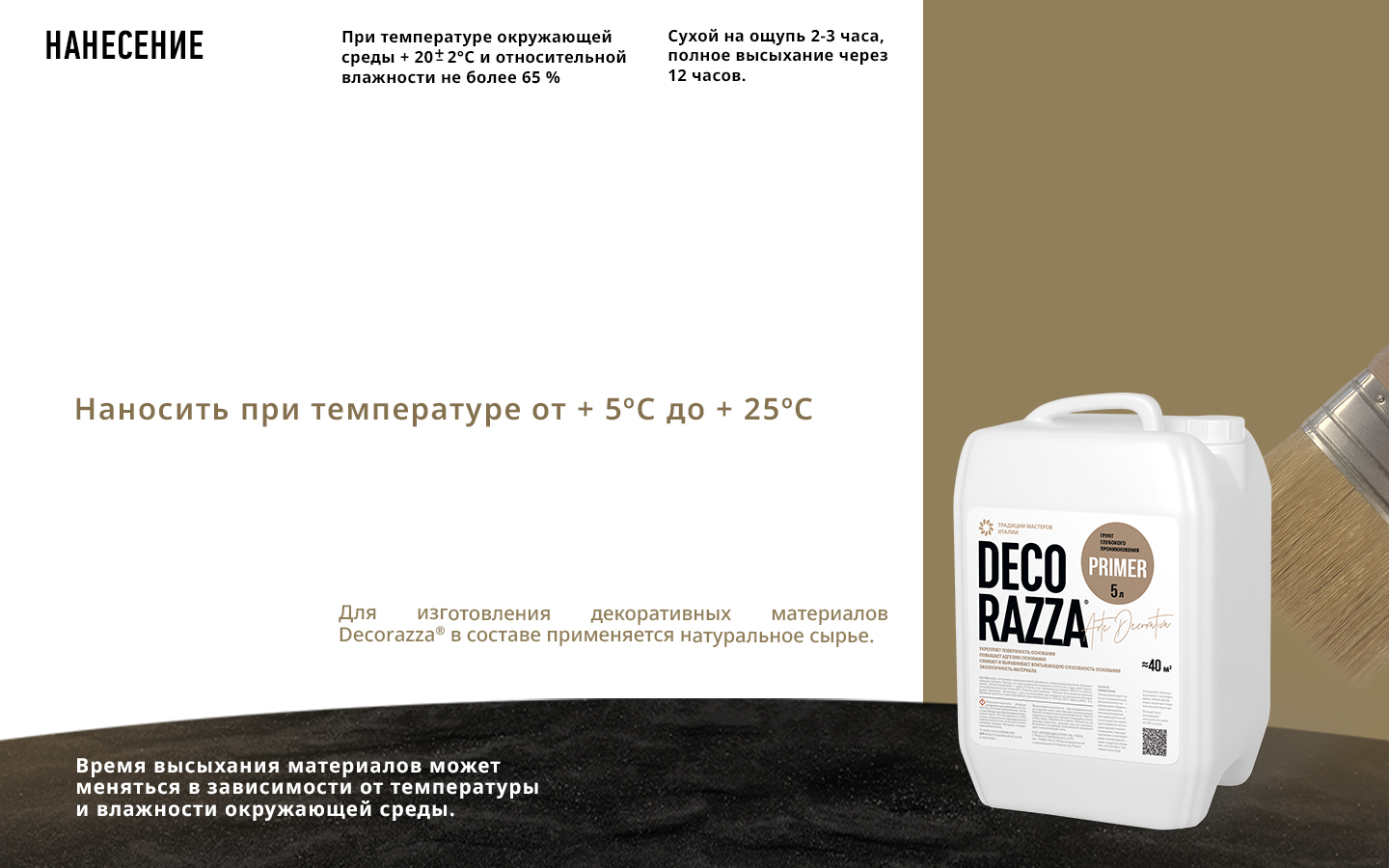 Грунт Decorazza PRIMER — это высококачественная акриловая грунтовка, специально разработанное для минеральных поверхностей, таких как бетон, кирпич и штукатурка. Этот грунт обладает уникальной способностью глубокого проникновения, что обеспечивает прочное и долговечное сцепление с основанием, обеспечивая идеальную основу под последующие отделочные работы. Основные преимущества Decorazza PRIMER: - Укрепляющий эффект: Усиленный состав укрепляет поверхность, предотвращая образование трещин и отслаивание материала. - Без запаха: Благодаря экологичным компонентам, продукт не имеет неприятного запаха, делая его идеальным выбором для помещений с повышенными требованиями к качеству воздуха. - Проникающее действие: Глубокое проникновение грунтовки в поры поверхности обеспечивает надежную адгезии и устойчивость к влаге. - Широкий спектр применения: Идеально подходит для использования на бетонных, кирпичных и штукатурных поверхностях. Decorazza PRIMER гарантирует качественное основание для любых декоративных покрытий, обеспечивая их долговечность и устойчивость к внешним воздействиям.