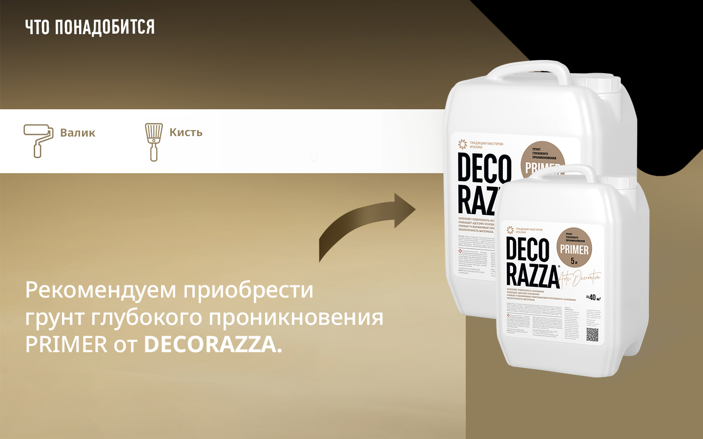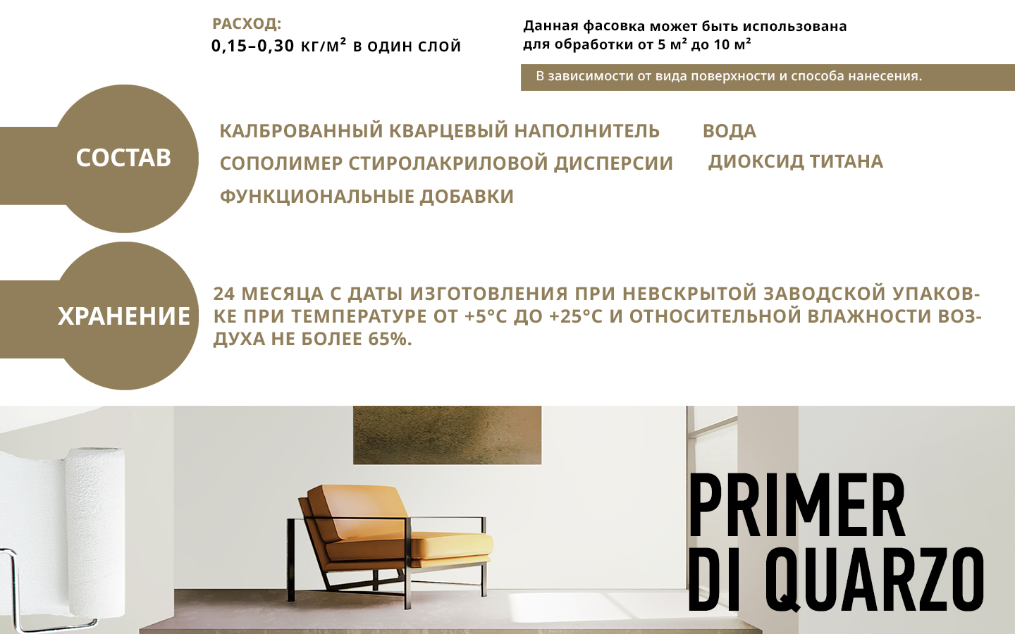 Для внутренних и наружных работ. Грунт-краска Primer di Quarzo применяется для цветового выравнивания подготавливаемой поверхности, а также для улучшения адгезии и удобства нанесения последующих финишных декоративных покрытий ТМ Decorazza.