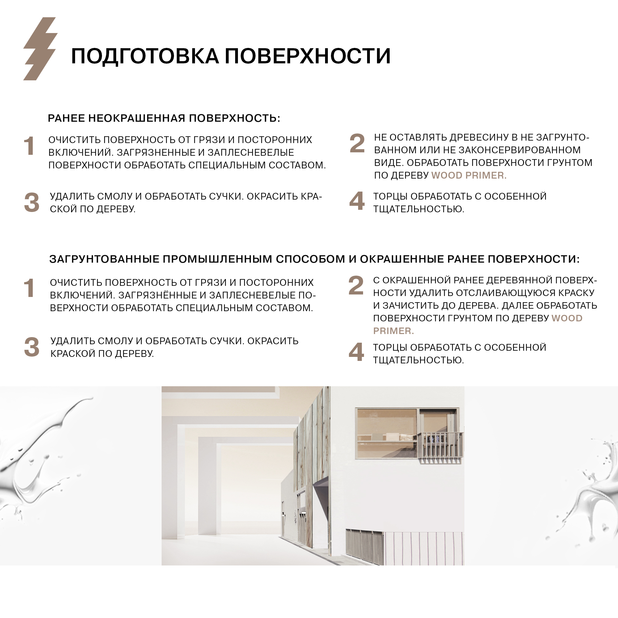 Ранее неокрашенная поверхность: очистить поверхность от грязи и посторонних включений. Загрязненные и заплесневелые поверхности обработать специальным составом. Не оставлять древесину в не загрунтованном или не законсервированном виде. Обработать поверхности грунтом по дереву Wood Primer. Удалить смолу и обработать сучки. Окрасить краской по дереву. Торцы обработать с особенной тщательностью.