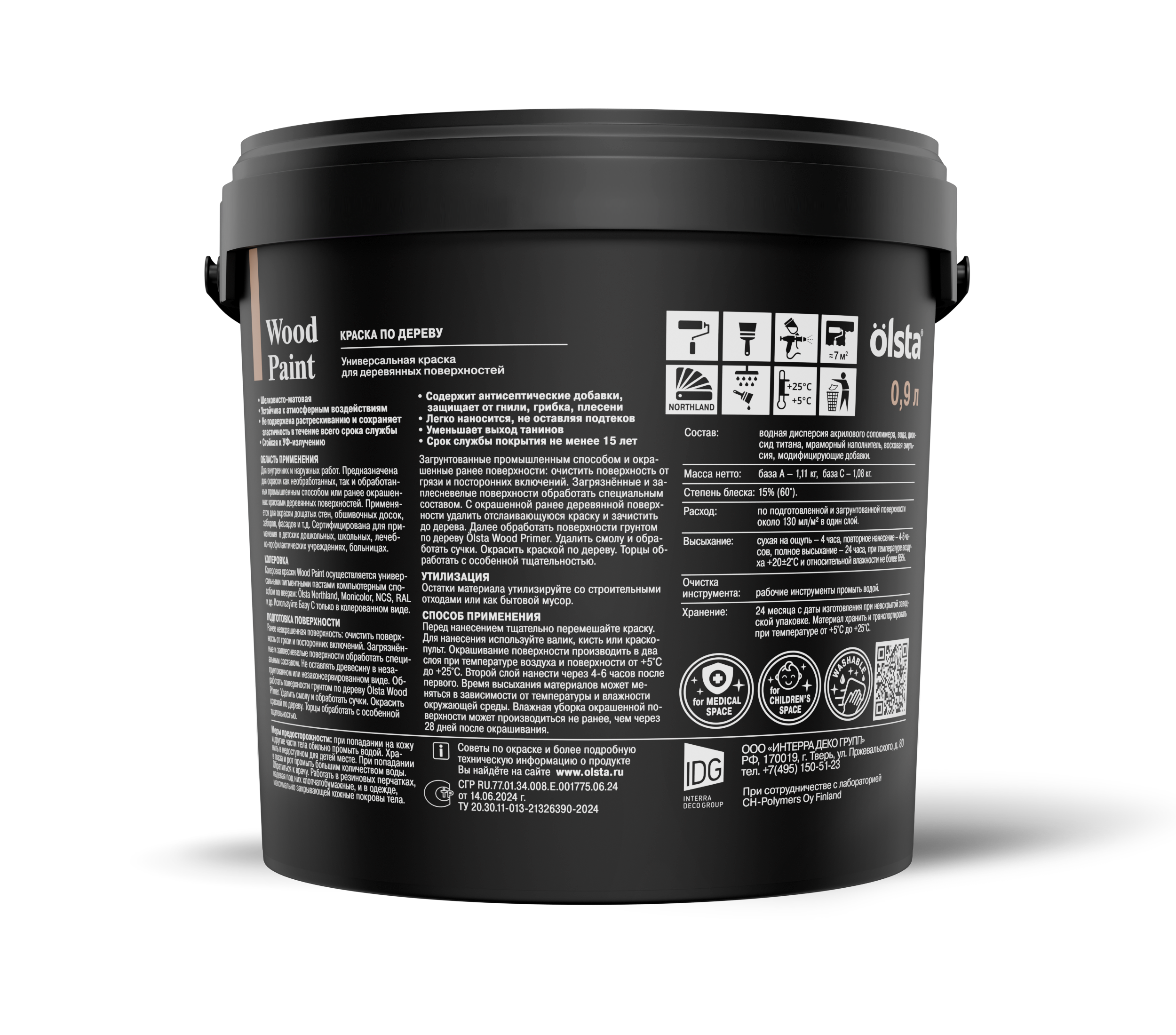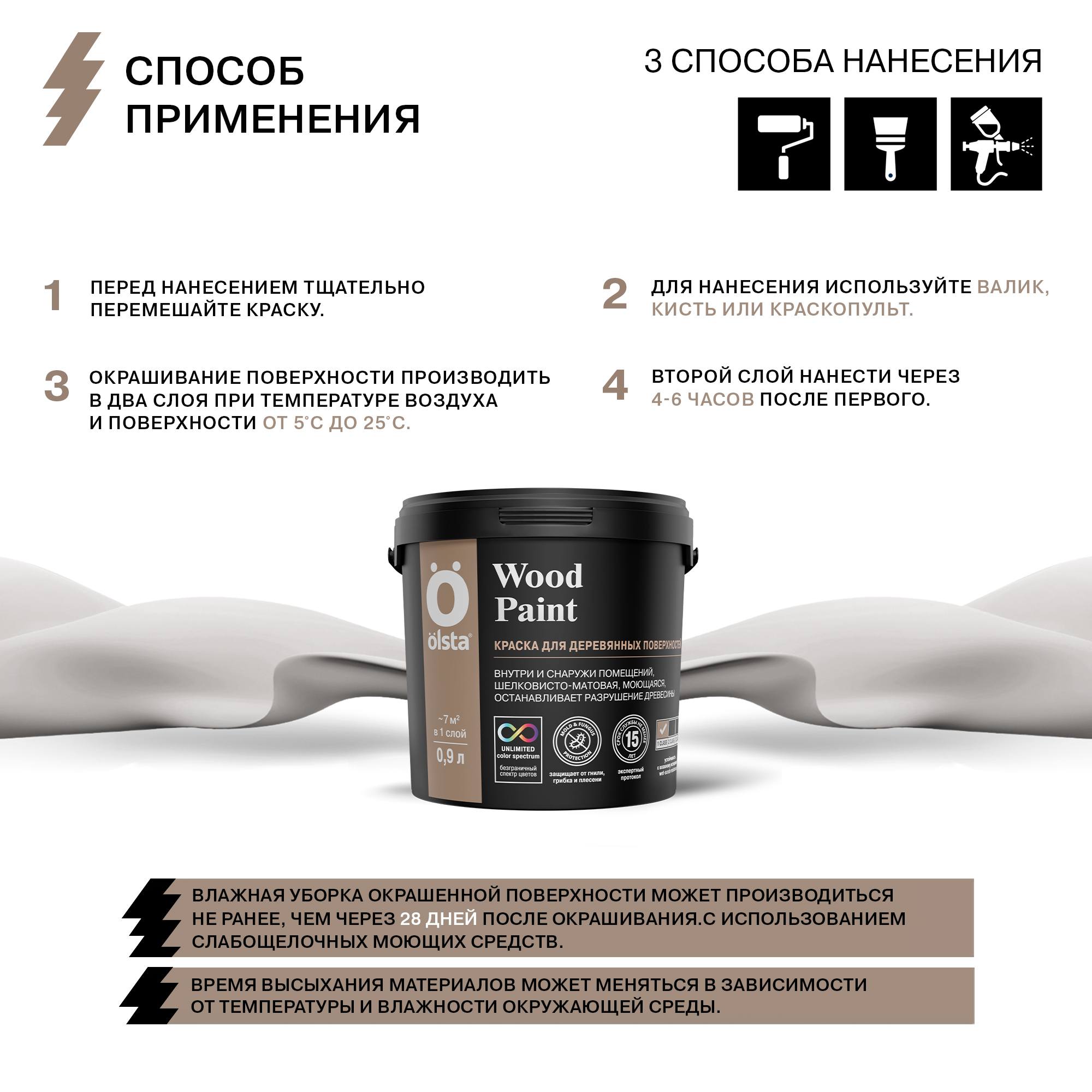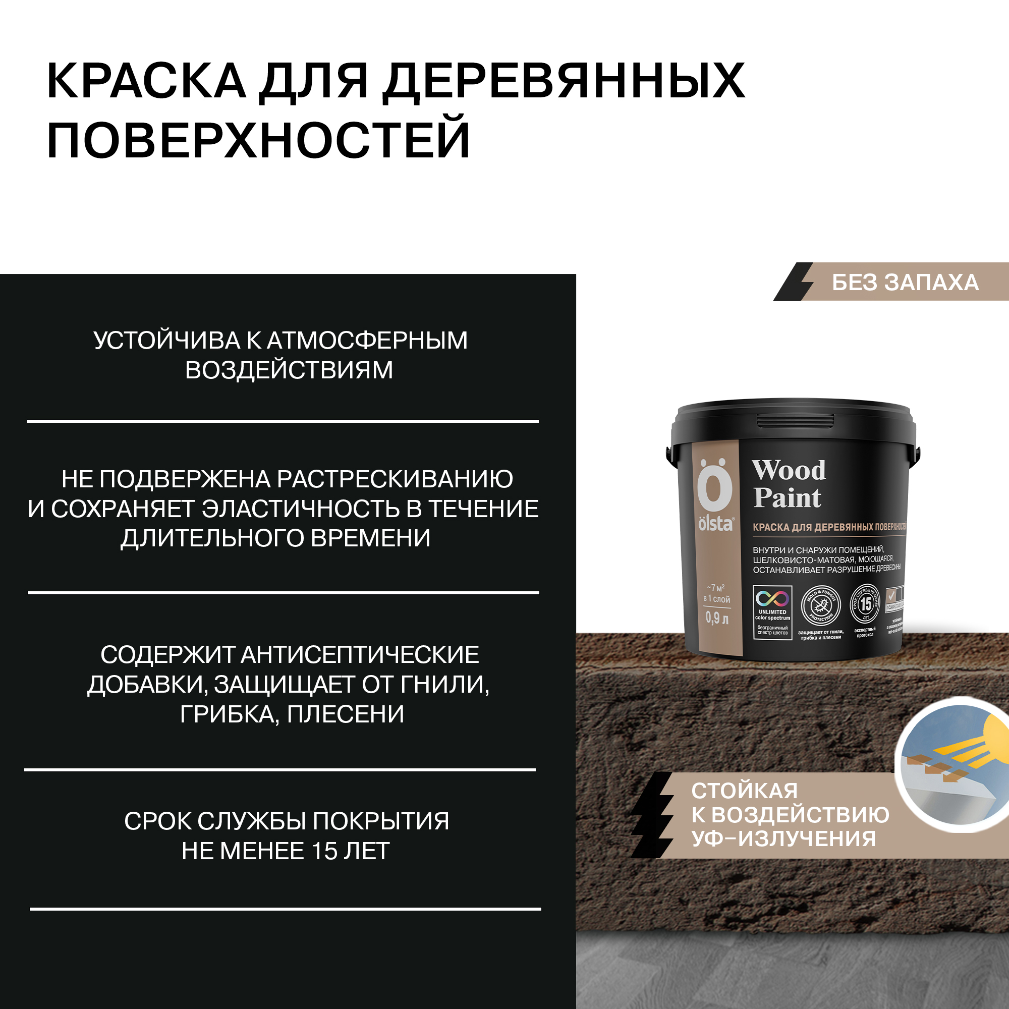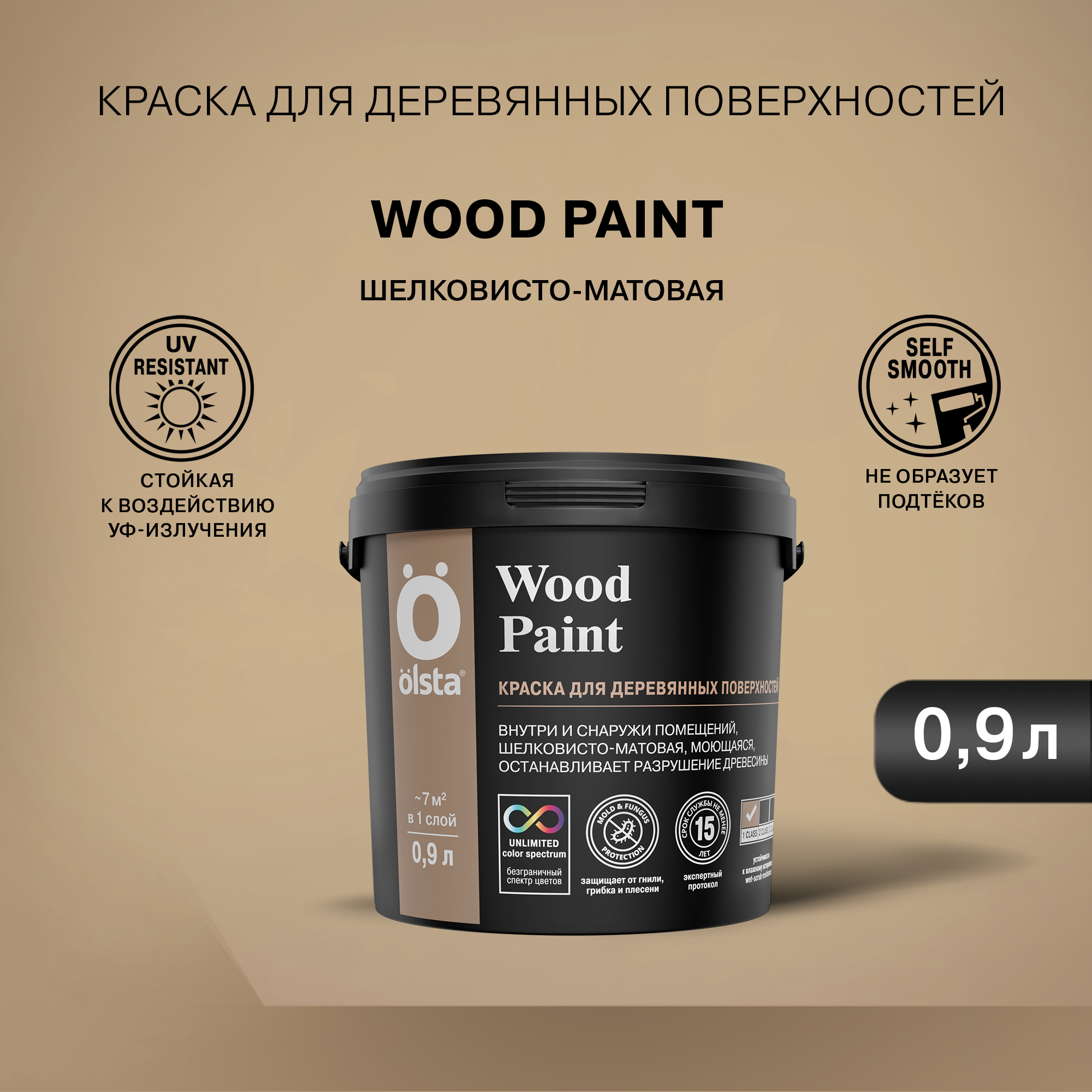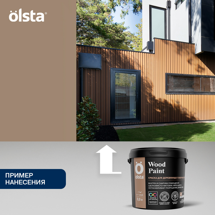 Акриловая краска Wood Paint торговой марки Olsta разработана специально для деревянных поверхностей (кроме дверей и оконных рам). Водно-дисперсионный материал формирует на поверхности полуматовую атмосферостойкую пленку, которая не растрескивается при усадке, надолго сохраняет эластичность, защищает древесину от гнилостных разрушений и образования плесени. Может использоваться при внутренних и наружных работах.