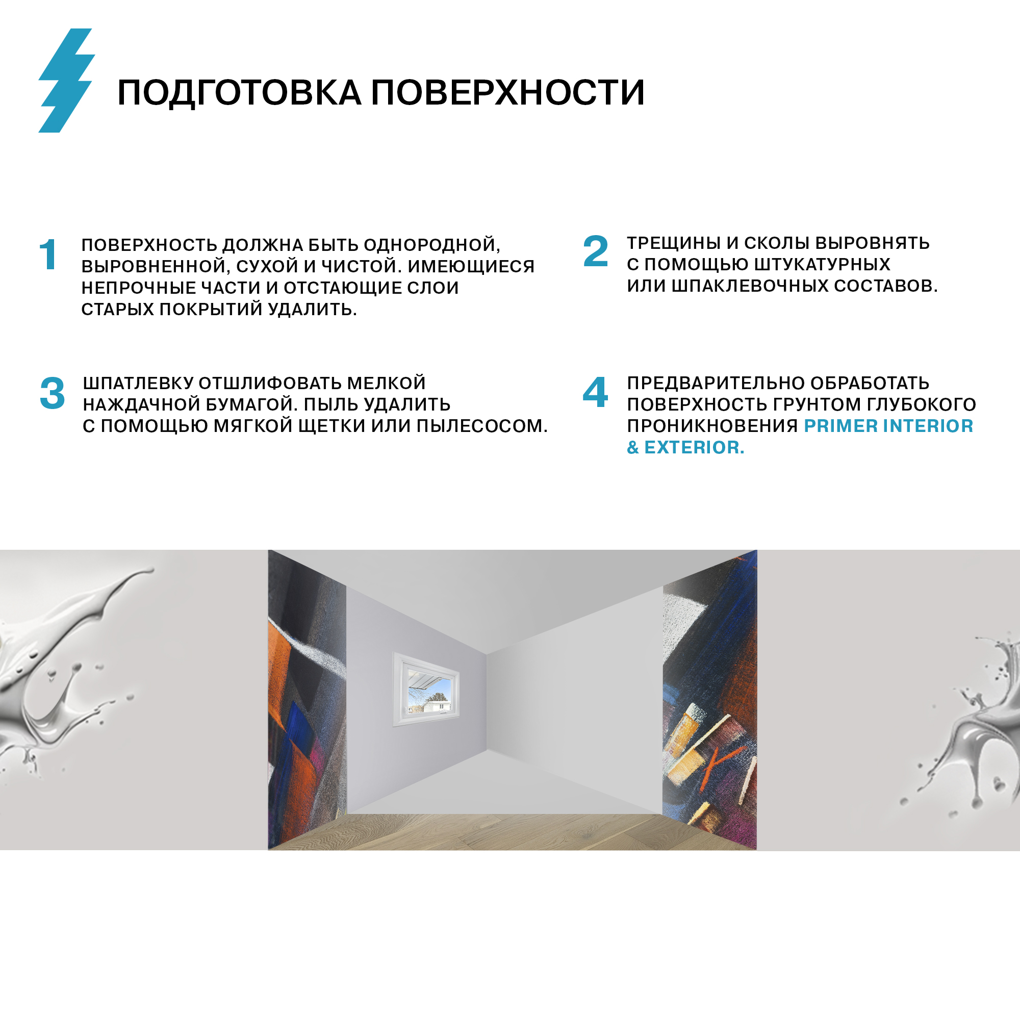 Поверхность должна быть однородной, выровненной, сухой и чистой. Имеющиеся непрочные части и отстающие слои старых покрытий удалить. Трещины и сколы выровнять с помощью штукатурных или шпаклевочных составов. Шпатлевку отшлифовать мелкой наждачной бумагой. Пыль удалить с помощью мягкой щетки или пылесосом. Предварительно обработать поверхность грунтом глубокого проникновения Interior Primer