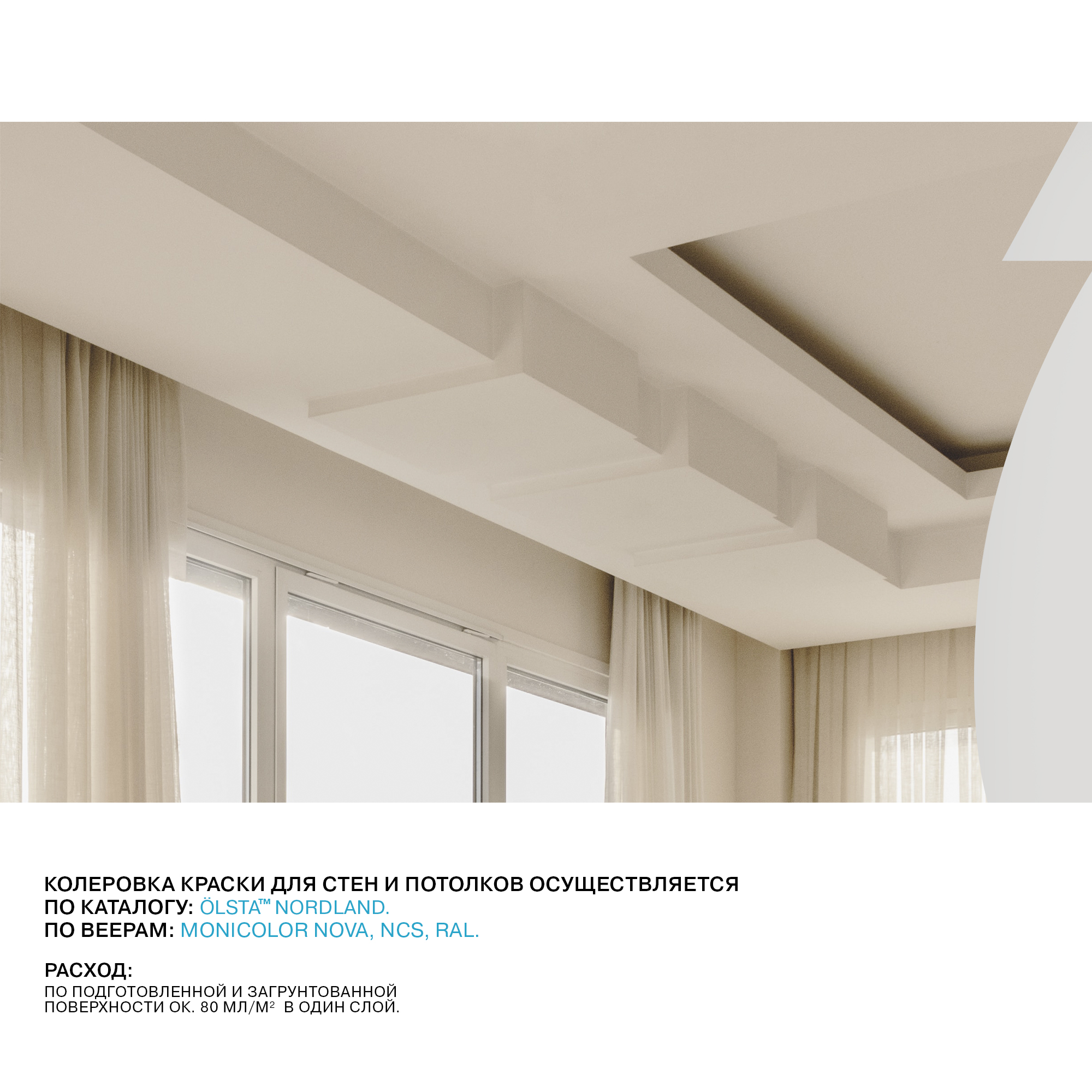 Белоснежная, глубокоматовая акриловая краска, разработанная для нанесения на потолки, создает однородное матовое покрытие и обеспечивает максимальное диффузионное отражение