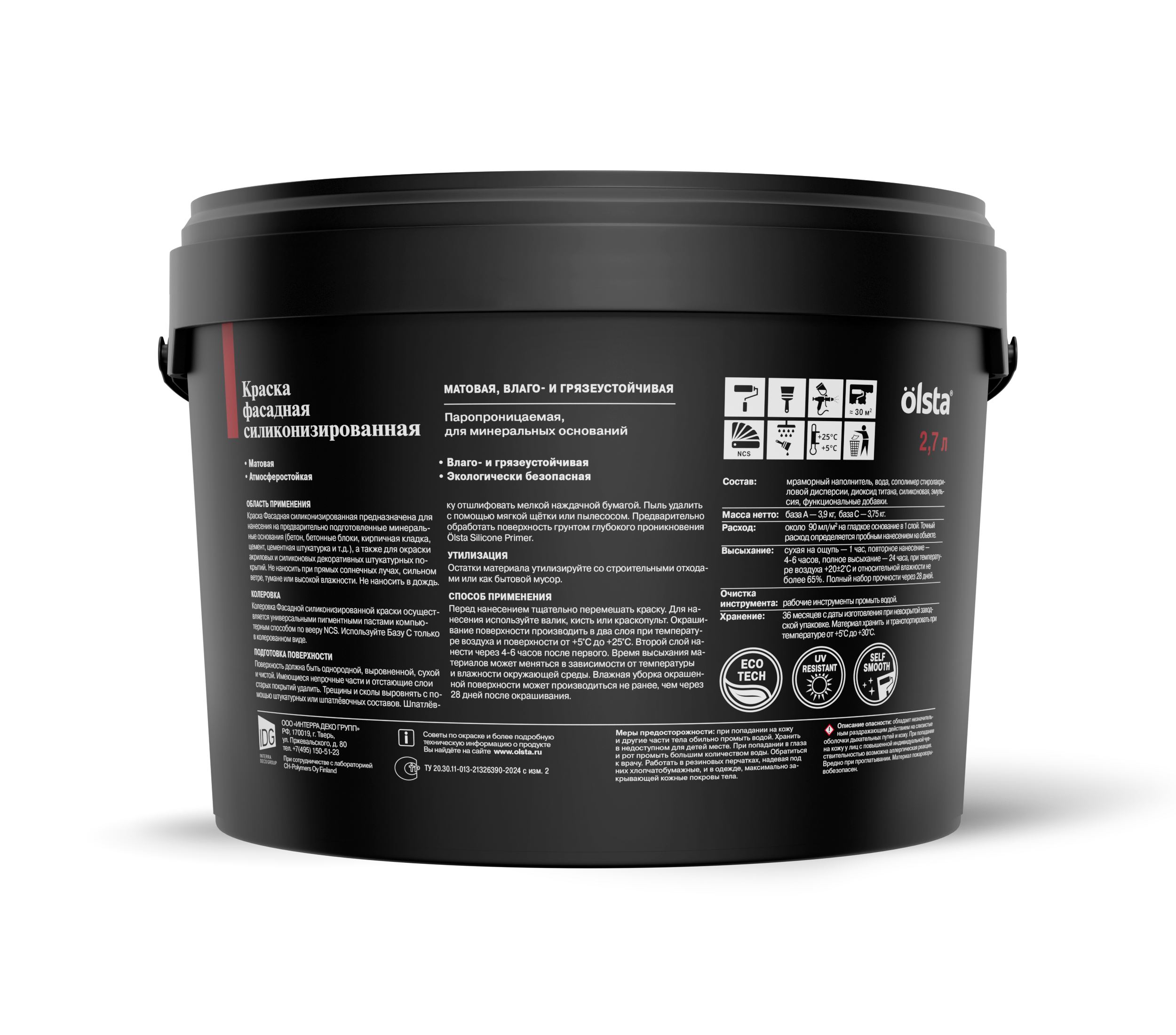 Поставляется в фасовках: 2,7 л; 9 л, образует матовое покрытие, применяется для наружных работ по минеральным поверхностям, расход литра: до 10 м2 в 1 слой.